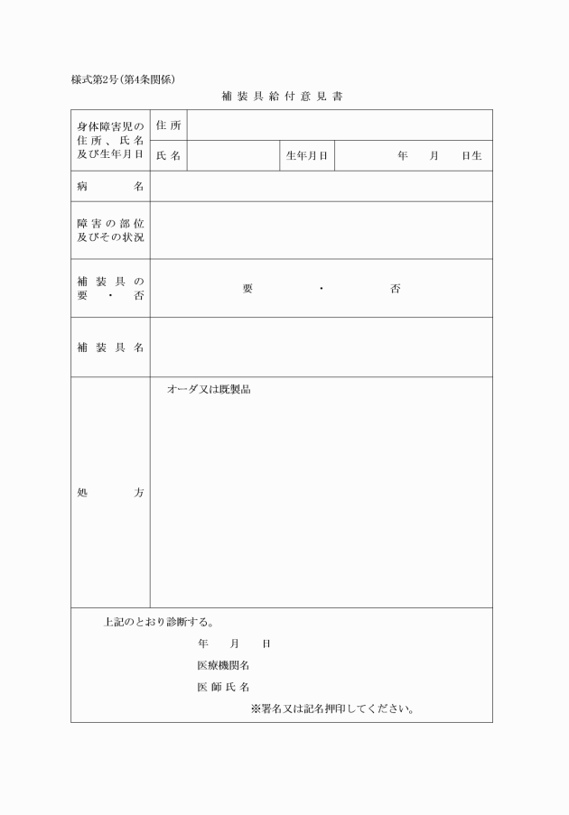 (1) 児童福祉法(昭和22年法律第164号。以下「法」という。)第19条第1項の規定に基づく療育の指導等を実施する保健所(以下「保健所」という。)の担当医師又は法第20条第4項に規定する指定育成医療機関(以下「指定医療機関」という。)の担当医師の作成した補装具給付意見書(様式第2号)