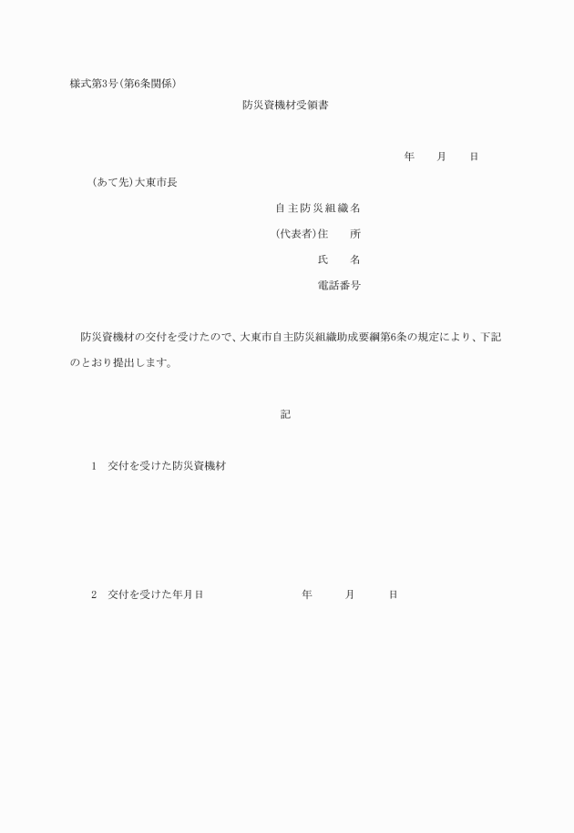 第3条 市長は、自主防災組織が設置されたときは、設置助成として、200,000円に相当する額を限度として、別表に定める防災資機材を予算の範囲内において交付する。