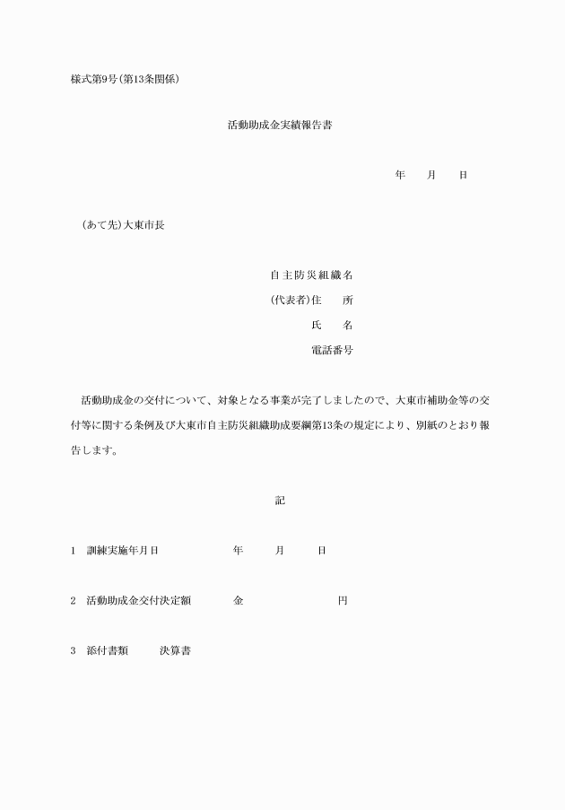 第13条 助成金の交付を受けた者は、防火防災訓練実施後30日以内に、活動助成金実績報告書(様式第9号)に次に掲げる書類を添付して市長に提出しなければならない。