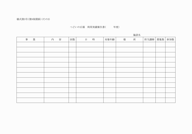 第9条 受託者は、毎月、事業を実施した月の翌月10日までにつどいの広場月間利用者数報告書(様式第2号)を市長に提出しなければならない。