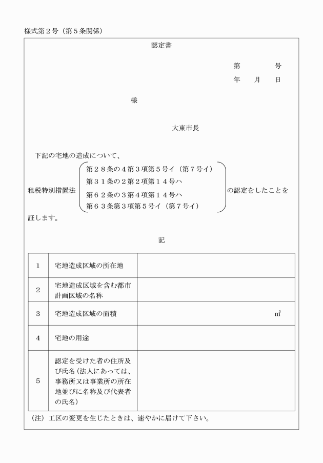 第2条 法第28条の4第3項第5号イ、第31条の2第2項第14号ハ、第62条の3第4項第14号ハ又は第63条第3項第5号イの認定を受けようとする者は、宅地の造成に着手する前に優良宅地認定申請書(様式第1号)を市長に提出しなければならない。