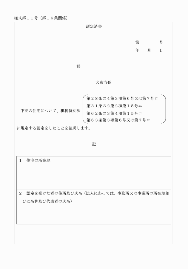 第11条 法第28条の4第3項第7号イ及び第63条第3項第7号イの認定を受けようとする者は、第2条の規定にかかわらず、優良宅地認定申請書に都市計画法(昭和43年法律第100号)第29条の許可を受けた年月日及びその番号並びに同法第36条第2項の検査済証の日付及び番号を記載したものを市長に提出しなければならない。