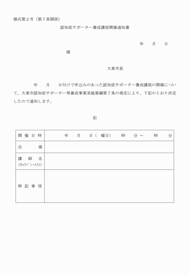 2 市長は、養成講座の開催を決定したときは、認知症サポーター養成講座開催通知書(様式第2号)により、申込者へ通知するものとする。