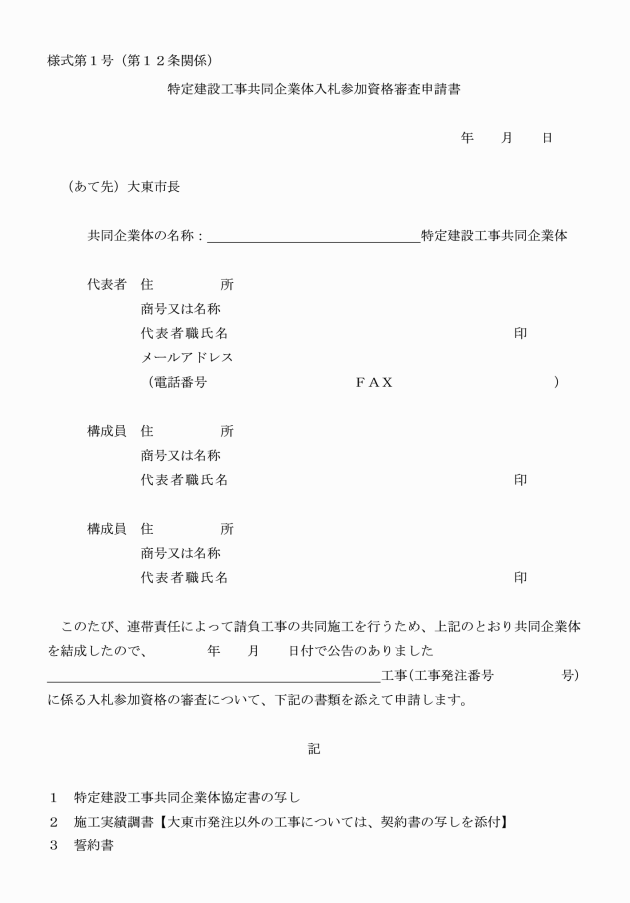 第12条 入札(大東市契約規則(平成10年規則第10号)第2条第4号に規定する電子入札案件(以下「電子入札案件」という。)を除く。)に参加しようとする特定建設工事共同企業体は、市長が別に定める申請期限日までに、特定建設工事共同企業体入札参加資格審査申請書(様式第1号)に次に掲げる書類を添付して提出しなければならない。