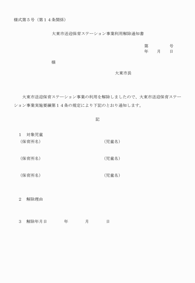第13条 利用者は、保育所を退所する等の理由により事業の利用を中止するときは、大東市送迎保育ステーション事業利用中止届(様式第4号)により市長に届け出なければならない。