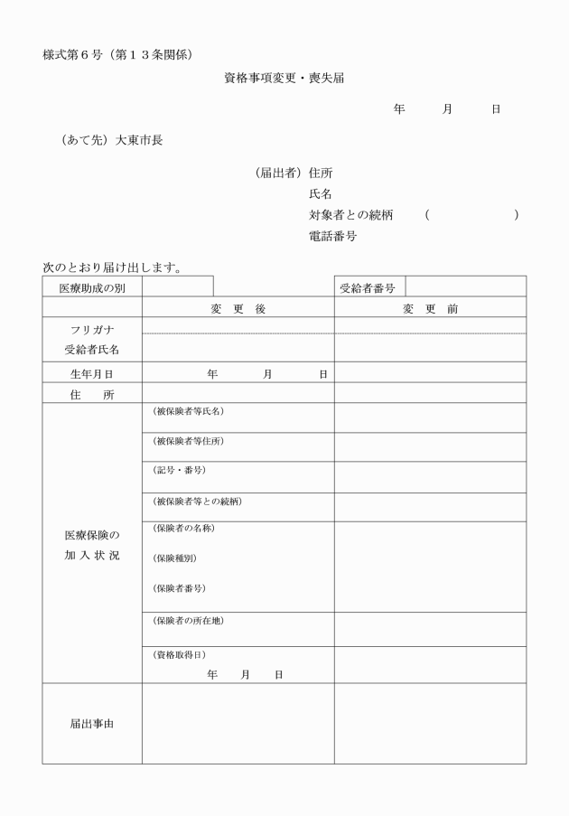 第12条 受給者は、医療証を破損し、汚損し、又は紛失したときは、医療証交付申請書を市長に提出して、再交付を申請することができる。