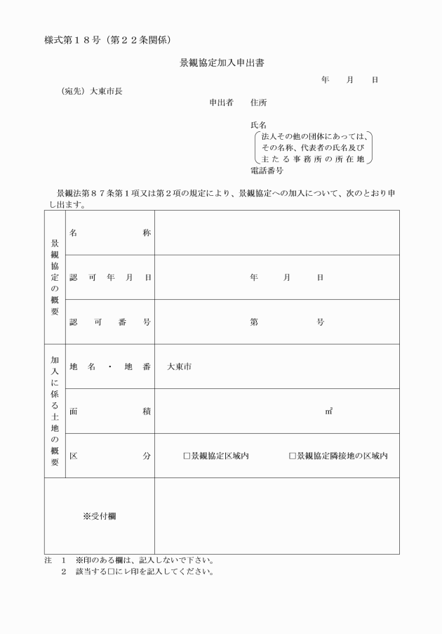 第22条 法第87条第1項又は第2項の規定により、景観協定に加入しようとする者は、景観協定加入申出書(様式第18号)に次に掲げる図書を添付して、市長に提出しなければならない。