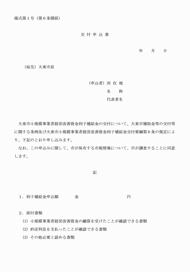 第6条 利子補給金の交付を受けようとする補助事業者は、交付申込書(様式第1号)に、次に掲げる書類を添付して、利子補給金の交付を受けようとする年度の2月末までに大東商工会議所を通じて市長に提出しなければならない。