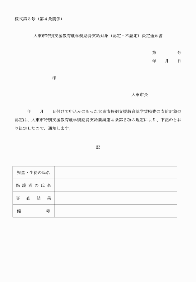 第1条 この要綱は、特別支援学校への就学奨励に関する法律(昭和29年法律第144号)の趣旨に基づき、大東市立小学校又は中学校の支援学級(学校教育法(昭和22年法律第26号)第81条第2項に規定する特別支援学級をいう。次条において同じ。)に在籍する児童又は生徒(以下「児童等」という。)の保護者の経済的な負担を軽減するため、大東市特別支援教育就学奨励費(以下「就学奨励費」という。)を支給することについて、必要な事項を定めることを目的とする。