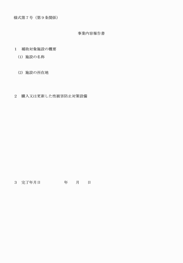 第3条 補助金の交付の対象となる事業(以下「補助対象事業」という。)は、補助対象施設においてパーティション、簡易扉、簡易更衣室、カメラその他の性被害防止対策を図るために必要となる設備(以下「性被害防止対策設備」という。)の購入又は更新を行う事業とする。