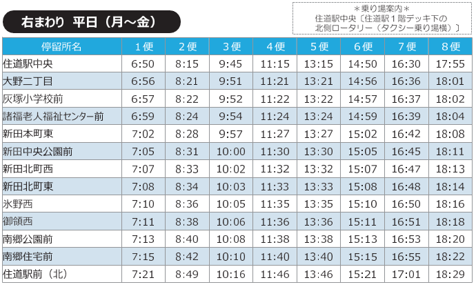 住道駅の北側ロータリーと中央ロータリー(デッキ下)を起点として、主に市内の西側を運行しているコースです。