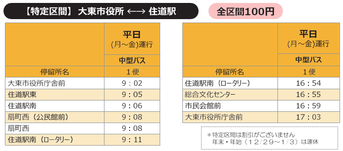 ・特定区間:全区間100円 (特定区間は割引がありません。)