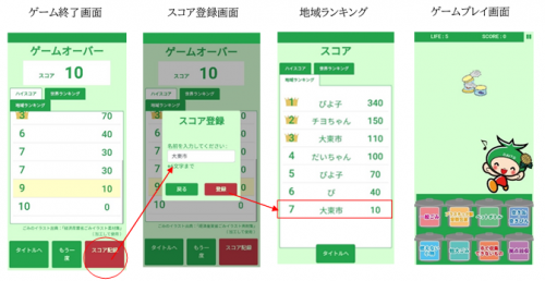 スコア記録ボタンをタップすると、地域ランキングに登録され、大東市ごみ減量化ゲームをプレイした人の中で順位を競うことができます。トップ画面のスコアをタップすると、自分のハイスコアやランキングを確認することもできます。