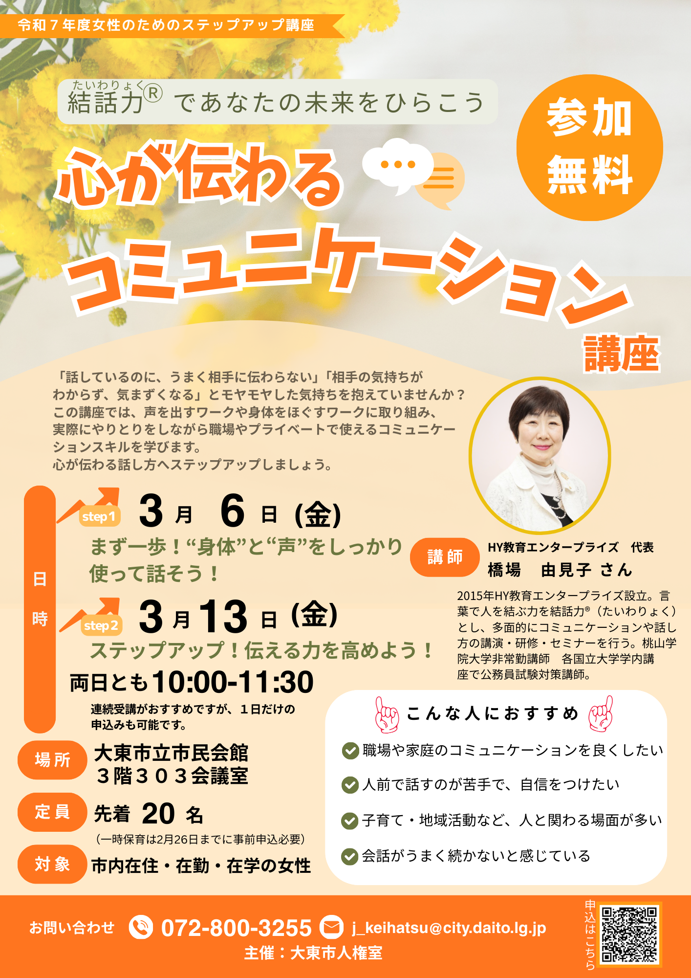 令和8年3月6日、3月13日(両日とも金曜日)、HY教育エンタープライズ代表、橋場由見子氏をお迎えし、『心が伝わるコミュニケーション』をテーマに講座を開催しました。
