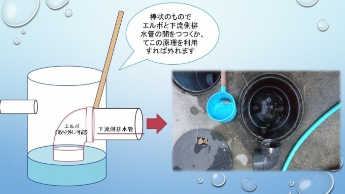 - まず、棒状のもので曲管(エルボ)と下流の管の間をつつくか、てこの原理を利用して曲管(エルボ)を外します。