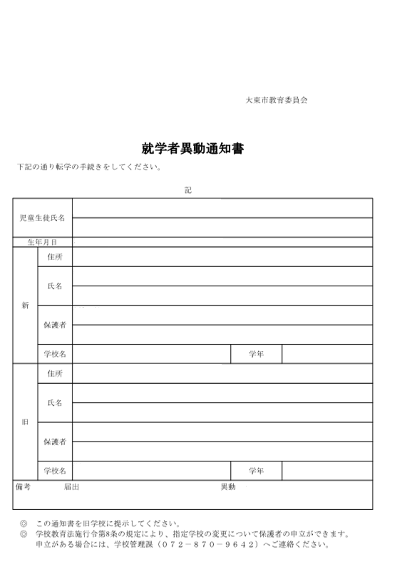 注意事項:外国籍の児童・生徒は学校管理課に来てください。 - 転出する学校へ「就学者異動通知書」を提示