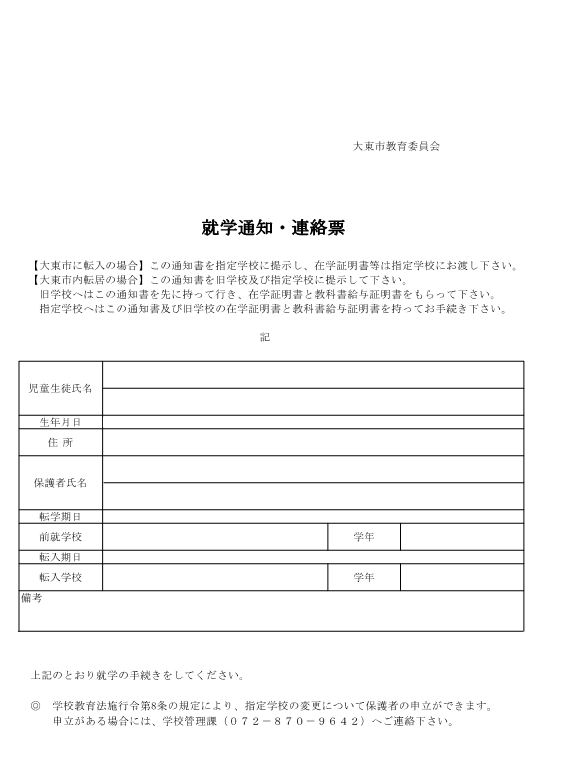 注意事項:外国籍の児童・生徒は市民課で外国人登録の届け出をし、その後学校管理課に来てください。 - 転入する学校へ「就学通知・連絡票」を提示