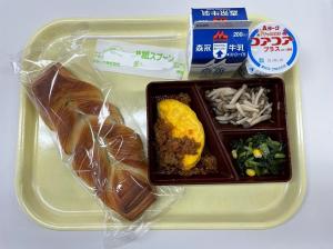 1月26日(火曜日)【デニッシュパン・オムレツミートソースかけ・きのこのバター煮・小松菜とコーンの炒め物・ヨーグルト・牛乳】