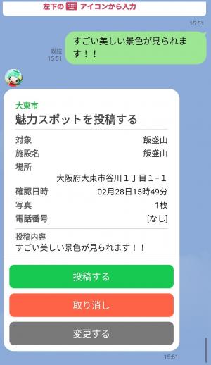 (2)手順に従い位置情報やおすすめスポットの写真を送信し、おすすめの理由など詳しい情報をトークに送信してください。確認画面が表示されるので、「投稿する」ボタンをタップすれば完了です。