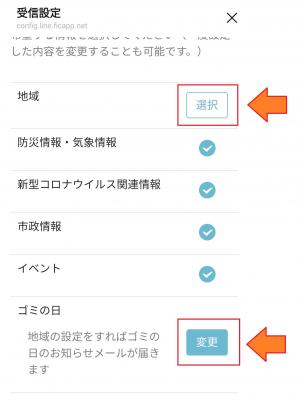 受信設定ボタンをタップした後、(1)お住まいの「地域」を選択し、(2)「ゴミの日」からゴミの種類を選択するだけです。