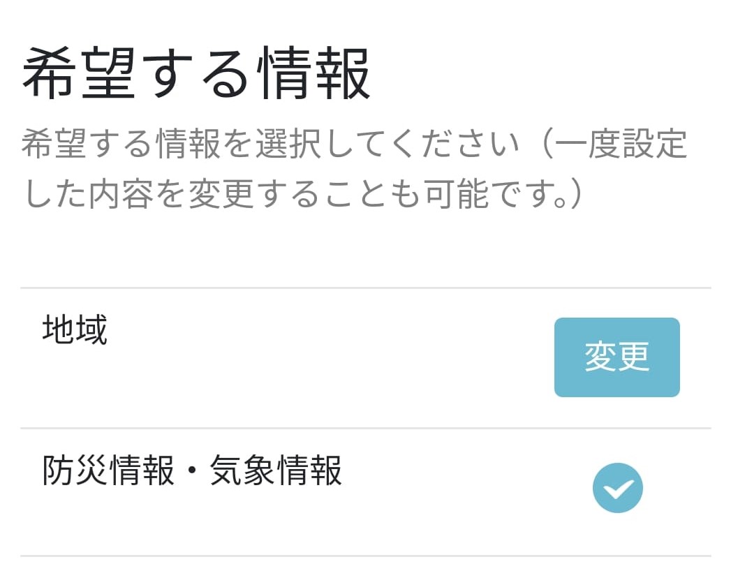 受信設定ボタンをタップした後「防災情報・気象情報」にチェックを付け、設定ボタンをタップしてください。